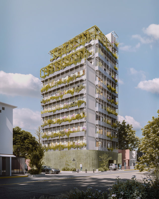 Guadalajara, Mexico, is experiencing the most significant vertical development in its history as a counterweight to the urban sprawl of the past century. The rapid pace of new construction has fostered low costs, quick processes, and substandard living spaces for residents. Amidst this chaos, Torre Fauna seeks to be a game changer in Guadalajara’s real estate market. This may seem egocentric, but we are confident that housing developers in our city are neglecting basic design principles and focusing solely on financial objectives. Our proposal adheres to low-tech criteria, aiming to reduce energy consumption and achieve thermal comfort within the dwellings. Most importantly, it features efficient and agile unit layouts. A small living. area does not equate to diminished well-being. This project endeavors to spread these simple design choices to other developers. People deserve high-quality vertical living, not just "cheap and fancy" options. We advocate for great quality and balanced costs. As a social commitment to combat housing unaffordability, we will donate a small house to a family in need, selected by a local foundation. Additionally, we will provide an artpiece by an emerging artist on the rooftop of the building, fostering community bonds and supporting local creators. Local residents now value aspects such as eco-friendly concepts, mid-rise buildings, walkability, neighborhood services, collective mobility, and community engagement. Torre Fauna offers these and more, making it an excellent project for both investment and living. |